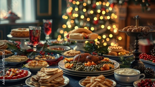 food, table, dinner, meal, salad, buffet, eatery, christmas, vegetable, plate, meat, glasses