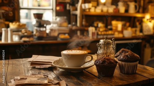A charming bakery table with a hot mocha, chocolate muffins, and a warm, inviting atmosphere.