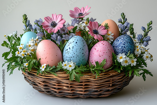 A charming Easter basket filled with bright pastel eggs, decorative bunnies and flowers, creating a festive and joyful atmosphere of spring