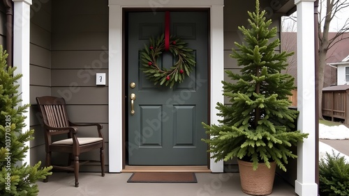 A charming front entrance door adorned with a festive Christmas wreath and lush winter greenery, capturing the season