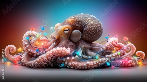 A charming octopus, adorned with luminous heart-shaped lights, resting in an artistic and colorful display, symbolizing affection and creativity in an imaginative scene.