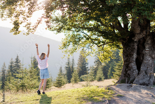 A charming picturesque view of the mountains. A young woman is standing near a big tree on a hill and raised her hands up. Carpathian Mountains