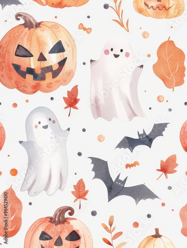 A charming watercolor pattern featuring happy ghosts, carved pumpkins, and bats, perfect for adding a touch of festive fun to your Halloween projects.