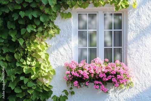 window, flower, pink, plant, vine, greenery, nature, decor, home, exterior, beauty, sunlight, architecture, garden, peaceful, vibrant, colours, blossom, summer, rustic, residential, landscape, charme, calmness, aesthetic, design, floral, growth, environment, scene, bungalow, view, bright, inviting, refreshing, picturesque, elegance, lifestyle, soft, warmth, texture, detail, arrangement, foliage