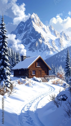 A charming wooden cabin nestled amid a snowy landscape, with a towering snow-capped mountain backdrop under a bright blue sky