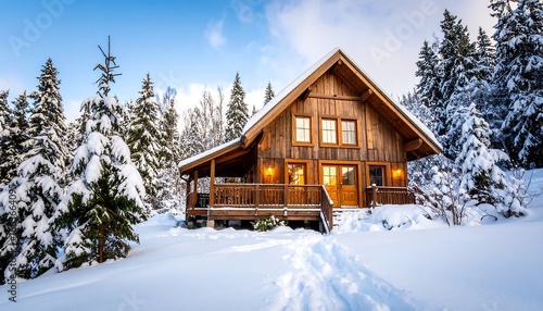 A charming wooden cabin sits nestled amongst snow-covered evergreens on a serene winter's day.