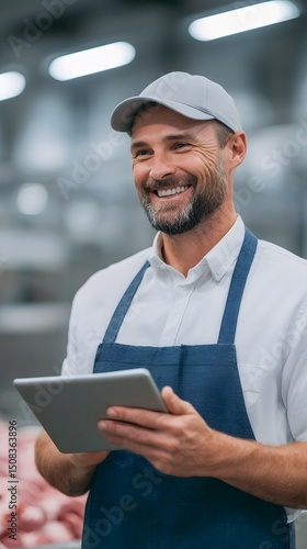 happy, meat, industry, supervisor, tablet, smiling, business, technology, food, food industry, supervision, management, men at work, employee, smile, happiness, positivity, work, office, corporate, professional, communication, digital, device, screen, information, datum, content, male, adult, casual attire, attire, gesture, expression, focused, engaged, interested, productive, success, efficiency, leadership, teamwork, organisation, industrious, diligent, satisfied, comfortable, confident, optimistic