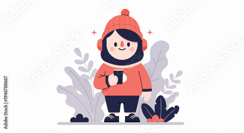 cartoon, character, illustration, cute, adorable, friendly, warm, cosy, winter, cold, season, hat, beanie, pom-pom, sweater, shirt, mug, cup, drink, beverage, hot drink, tea, hot, holding, hand, person, figure, isolated, white, background, plant, leaf, foliage, stylised, simple, flat, design, minimal, graphic, art, digital, creative, cheerful, happy, smiling, star, sparkle, festive