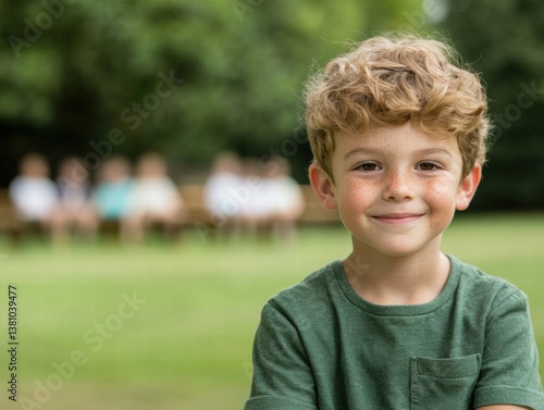 A cheerful boy with curly hair smiles at the camera, with blurred figures of children sitting in the background on a sunny day.