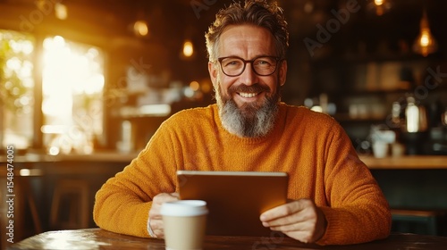 A cheerful man with a beard, glasses, and an orange sweater smiles while sitting in a cozy café, symbolizing comfort and creativity in a warm atmosphere filled with light.