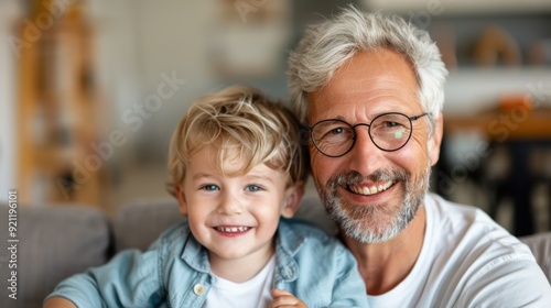 A cheerful older man with grey hair and glasses shares a joyful moment with his young grandson, sitting on the couch indoors.