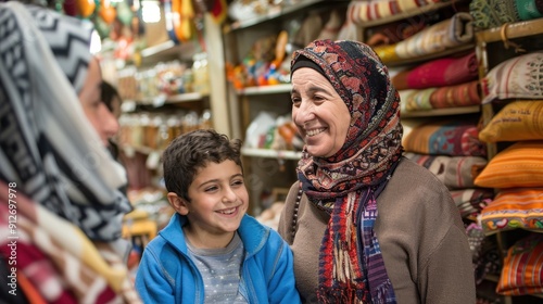 market, woman, boy, friends, middle eastern, colourful, textile, craft, culture, interaction, smiling, vibrant, community, shopping, joyful, tradition, family, warmth, socialising, people, expression, stall, good, pattern, heritage, craftsman, lively, atmosphere, marketplace, laughter, chatter, connection, neighbourhood, local, artisan, approach, exploring, trading, visitor, unique, selling, conversation, hand-made, smile, play, exploration