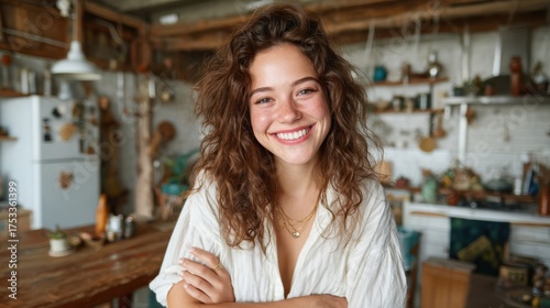 A cheerful young woman with curly hair smiles warmly at the camera in a rustic, bohemian kitchen filled with natural light, embodying warmth and creativity in everyday life.