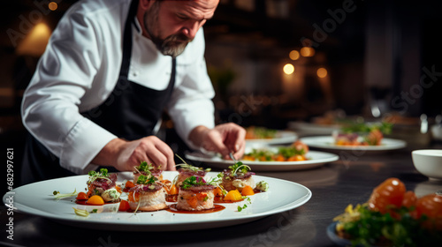A chef is finishing the preparation of the dish. She is decorating the dish just before serving. internal kitchen of the restaurant