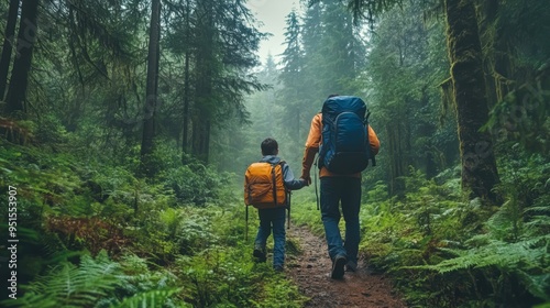 A child and an adult hike through a dense forest, surrounded by lush greenery and tall trees, perfect for promoting outdoor activities, adventure, family time, and nature exploration,
