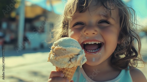 A child enjoying an ice cream cone on a hot summer day, the sweet treat melting in their hand as they grin with joy
