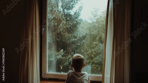 A child gazes contemplatively out a window, framed by curtains, at lush greenery, inviting thoughts of wonder and imagination.