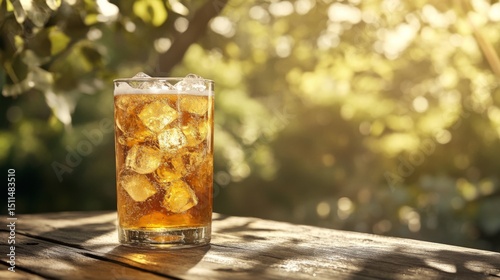 A chilled beer with ice cubes clinking in the glass, placed on a rustic wooden table with a blurred outdoor background.