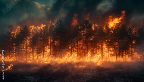 A chilling representation of a raging forest fire set beneath dark, ominous skies