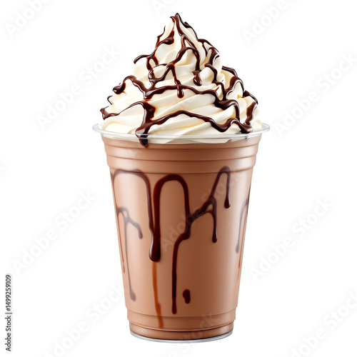 A chocolate milkshake with whipped cream and chocolate syrup in a clear plastic cup on black background isolated with white background