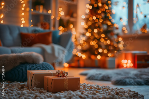 christmas, merry, decoration, celebration, ornament, christmas, traditional, seasonal, festive, winter, light, tree, living, room, couch, couple, box, floor, holiday, home, background, interior, gift, year, red, new, design, december, fireplace, house, present, beautiful