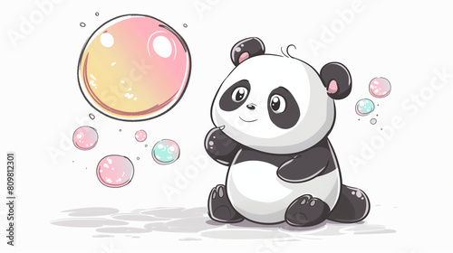 A chubby panda looks at soap bubbles, chibi illustration, cute animals