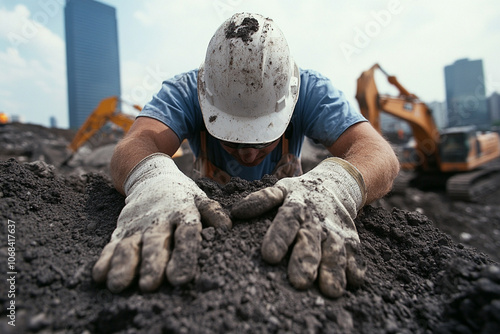 A civil engineer inspecting soil testing results on-site at a large infrastructure project.