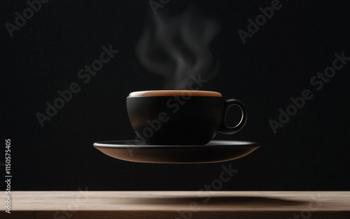 A classic americano cup levitating mid-air with steam rising dynamically, on a rich black background