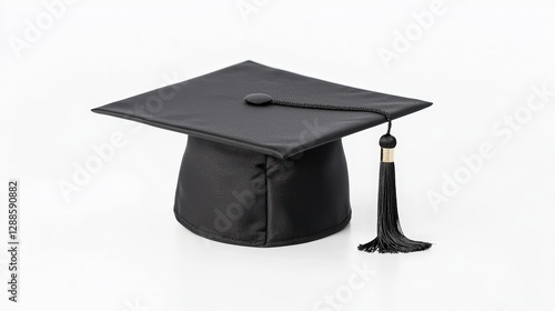 A classic black graduation cap sits on a white surface, symbolizing academic achievement and celebration. goal of life achievement learning. success,