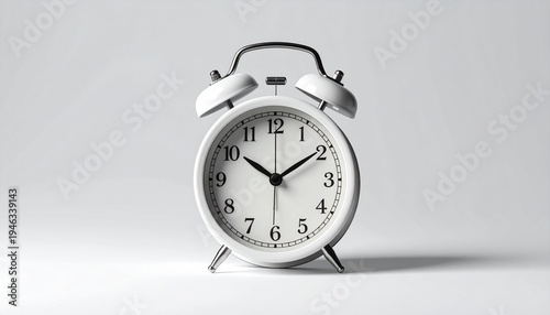 A classic white analog alarm clock with two bells on top is displayed against a plain white background