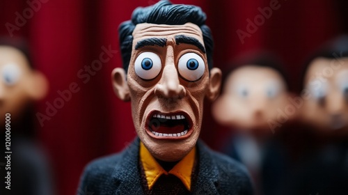 A claymation-style character exhibits a shocked expression, representing surprise and anxiety against a dramatic red backdrop