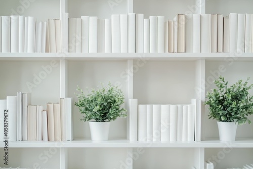 A clean and modern bookshelf filled with white books arranged neatly, complemented by small