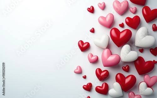 A clean white background with layered three-dimensional red and pink hearts creating depth for Saint Valentines Day