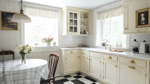 A clean white kitchen with retro finishes like brass hardware and a checkered floor.