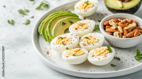 A clean white plate with keto-friendly deviled eggs, avocado slices, and a small bowl mixed nuts.