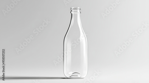 A clear, empty glass bottle stands against a plain, light gray background, casting a subtle shadow.