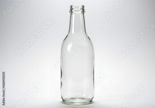 A clear, empty glass bottle stands upright against a plain white background, showing its shape.