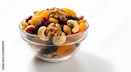 A clear glass bowl filled with a mix of dried fruits and nuts on a white background surface view