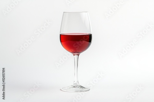 A clear wine glass filled with red wine against a plain background.
