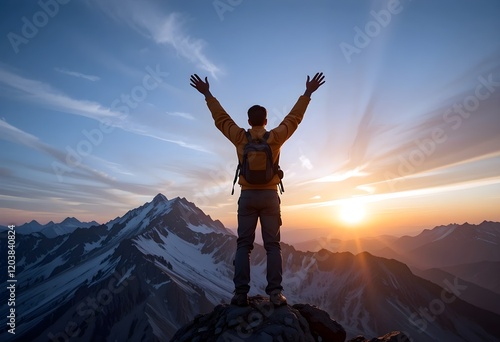 A climber on top of a mountain with his arms raised