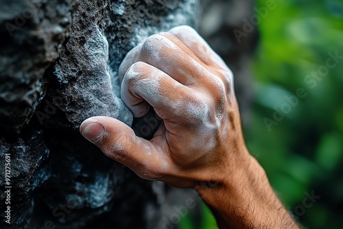 hand, gripping, rough, rock, face, during, challenging, ascent