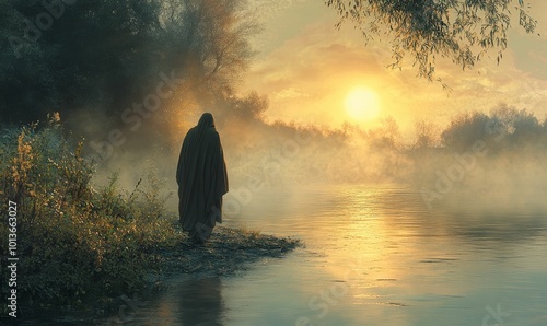 mist, fog, river, water, sunset, sunrise, gold, light, sky, cloud, silhouette, tree, forest, nature, tranquil, peaceful, serene, calm, magical, mystical, mysterious, lone, figure, person, hooded, cloak, unknown, landscape, outdoors