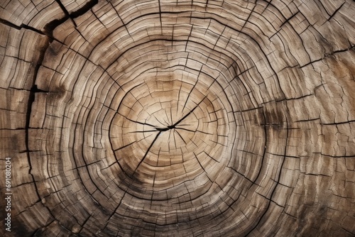 A close up macro texture and pattern of the aged grungy cracked tree trunk wallpaper, brown color and high detailed tree wood, round circle wood body, generated by AI.