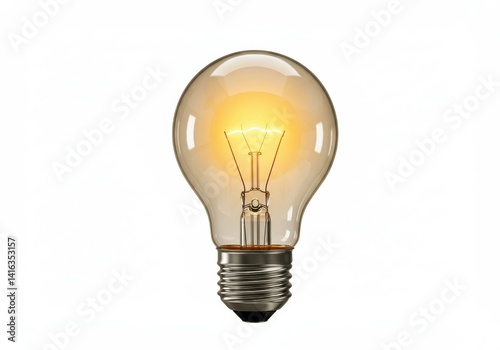 A close up of a lit incandescent light bulb with a visible filament on a white background image shot