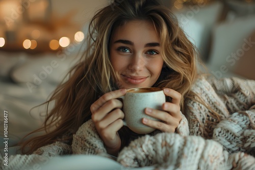 woman, hot drink, cup, tea, drink, drinking, beauty, smiling, mug, morning, home, beverage, hot, holding, face, person, smile, people, winter, lifestyle, bed, warm, 1, cafes, lady