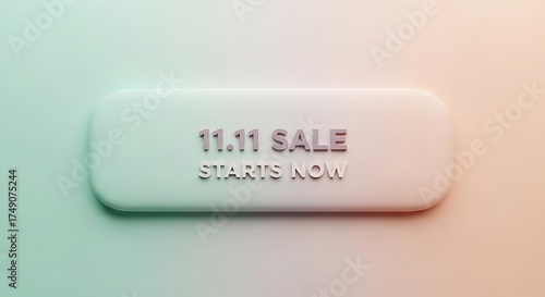 A close up of a white button with the words eleven eleven sale starts now on a gradient background