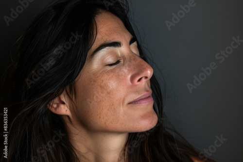 A close up of a woman's face with her eyes closed looking to a side