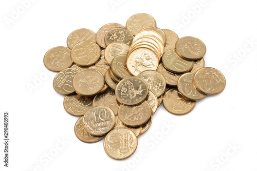 A close up pile, shot in macro, of a pile of Russian ten kopeyka coins on a clean, white background