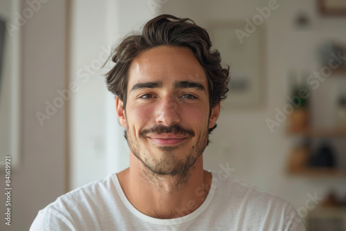 A close up portrait of a young man with a subtle smile