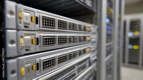 A close up view of stacked server racks in a modern data center showcasing metallic chassis and numerous network ports